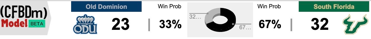 The Bulls played a much more demanding schedule, including the aforementioned battles with Boise State and Florida. They also took a licking at the hands of eventual CFP participant Miami (FL) in South Beach. USF’s final SOS+ was 51st in the country, with ODU coming in at 98th. Both squads achieved a nine-win regular season with the Bulls posting a higher “deserved wins” (dWIN) mark at 9.9, compared to 9.2.