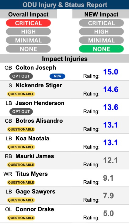 The Monarchs will be without their dynamic starting quarterback Colton Joseph [15.0], who has announced his intentions to enter the portal. He has not been practicing with the team. Therefore, it will be Quinn Henicle [10.9] drawing the start. We don’t have a ton on him, but he was impressive in limited duty a year ago when he was also Joseph’s backup. He doesn’t rate out super high, but he can make plays.