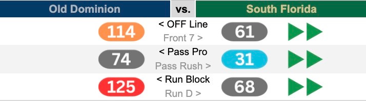 It’s worth noting that both offenses were two of the most explosive in nature this season with ODU coming in 2nd and USF 3rd in all of FBS football in our explosive plays metric. That said, that was with their dynamic quarterbacks leading the way, so we definitely expect that to slow down in this matchup. Old Dominion was better at limiting those chunk plays on the defensive side of the ball, finishing and impressive 33rd in flipped metric (USF was 71st).