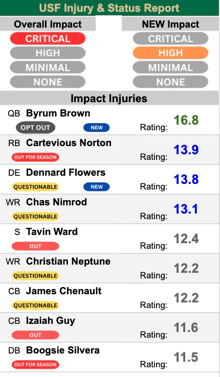 There is an outside chance that WR Chas Nimrod [13.1] will make his return after missing games since a week seven injury. He was moved to ‘questionable’ ahead of the week 14 game but did not play.