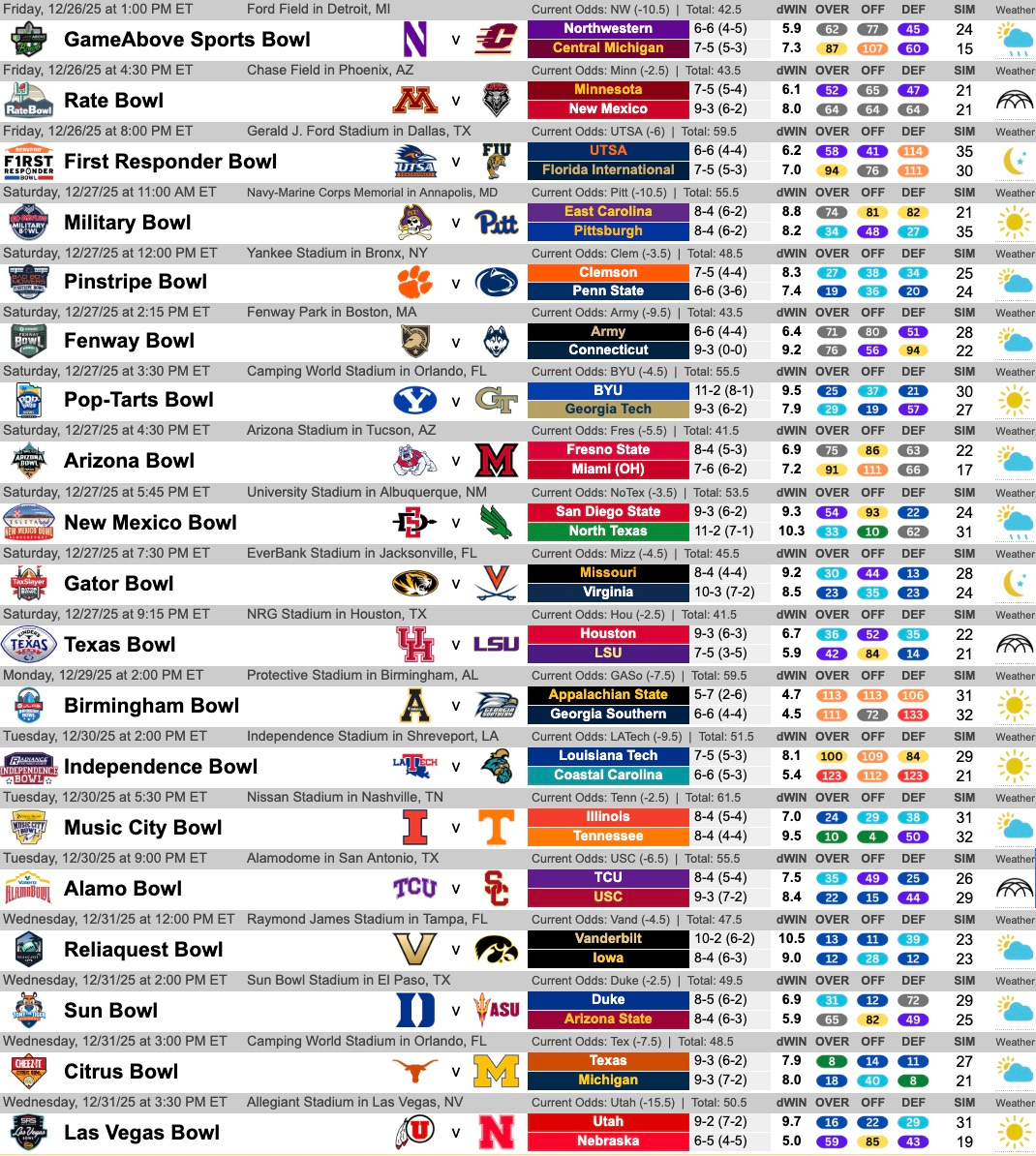 We are now fully into ‘bowl season’ with 16 games concluded — including 12 bowl games and four CFP first round matchups. We get back after it starting today in Detroit with the GameAbove Sports Bowl, one of 23 remaining bowl games. We have the CFP Quarterfinals commencing on New Years Eve/Day. Here is a screenshot of the “Run Down” from our Postseason Guide for an at-a-glance view: