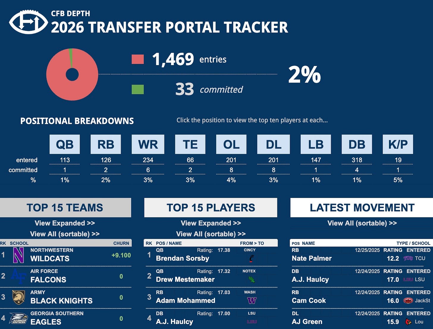 We will be launching a full-on portal tracker with all of the insights to stay on top of who is winning (and losing) the portal game this off season and leading into 2026. Here are some screenshots to get you excited. Our anticipated launch is portal opening day — January 2nd!