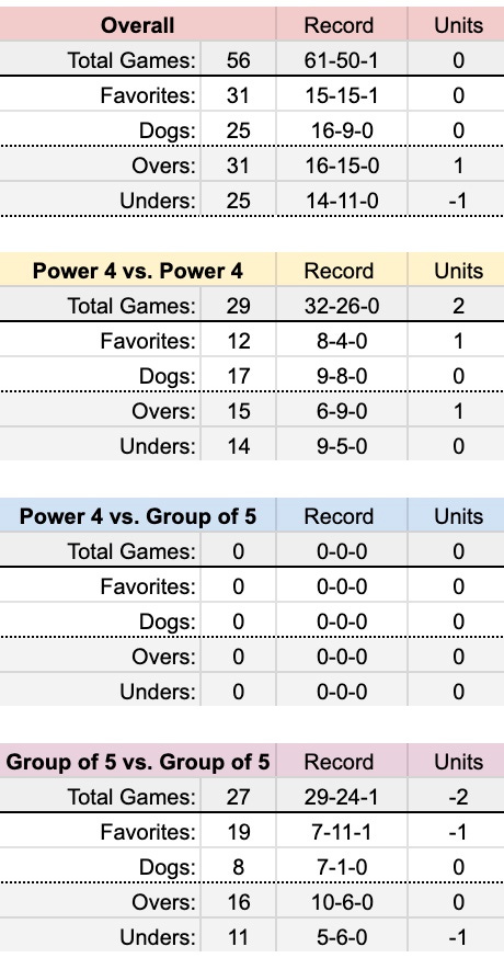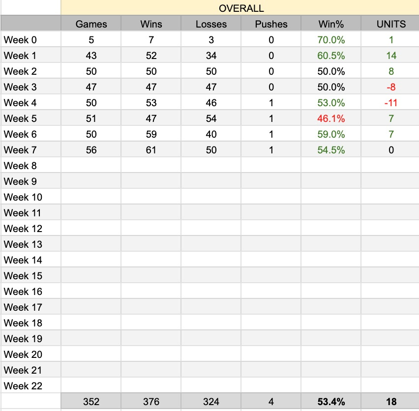 There are two ways to play this. You can lean into the suggested UNIT plays, which the Model identifies as the most lopsided relative to the spread at the time of publication. Or, you could ‘spray the board’ and play each individually, which is up +54 thus far on the season. We will provide some write-ups on what the Model (if it could talk) would describe each of the suggested plays, and then for our paid subs, we’ll get you the full slate of plays this week.