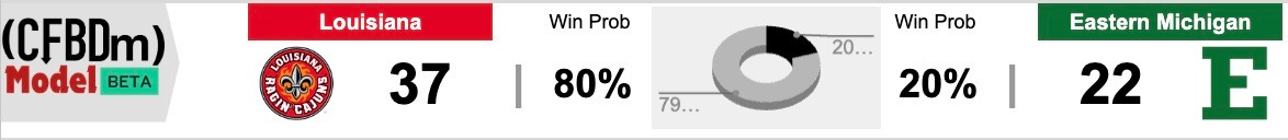 Another trend is emerging in the Model and it’s really liking this Louisiana Tech defense, and for good reason. They are showing well and the underlying talent level is backing it up. Both teams run it at a slow(er) pace and the Bulldogs are keeping the ball on the ground at a particularly high clip, leading to a lot of clock ticking. Both teams know how they want to win and the simulation has the game script of each playing ‘not to lose’ and setting the offenses up with long-fields and winning both time of possession, but field position battles. The Eagles have the most dynamic player on the field with QB Braylon Braxton providing a bit of a threat every time he has the ball and that gives a little pause, but he’ll need to do it against that stout LA Tech front.