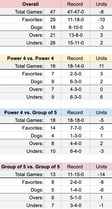 We had 29 favorites compared to just 18 underdogs on the sides overall. That went 19-28-0, resulting in a loss of 13 units. I began to think that we were giving too much weight to one metric, which led to such a result. We cooled the jets a bit, realizing it’s a one-week sample, and looking ahead at what our simulations produced this week, it’s back to a better balance between favorites (24) and dogs (26) in week four. We’ll keep an eye on it, regardless.