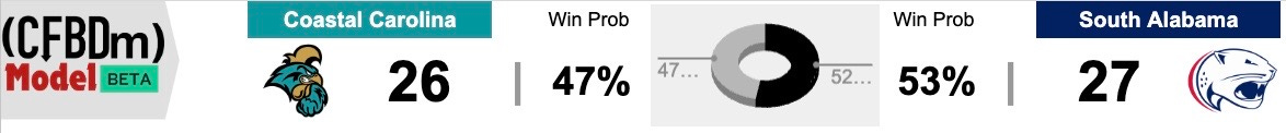 When scanning through these games earlier in the week, this one certainly didn't stand out to me. Coastal appears to be a shell of its former competent self, having played two non-competitive games against both Virginia (48-7) and East Carolina (38-0) thus far. Even the win over FCS Charleston Southern was a sleepy 13-0 victory. Tim Beck’s squad just doesn’t seem to have that mojo this year and is certainly in danger of having an abysmal season. Even our deserved wins (dWIN) metric suggests that Coastal only deserves some of that one win. At the same time, South Alabama played spiritedly against Auburn last week and posted just a two-point loss to Tulane in their home opener. So, what is going on here? One of the key points of this Model, which prioritizes talent level over past results, is to avoid getting caught up in that. Sometimes, this comes back to haunt us, as it continually focuses on what we see on paper (player-level data), but it never translates to the field. That’s usually a coaching issue — and we’ll make adjustments to factor that in. However, weird things happen and 15.5 points is a lot in a Sun Belt Conference opener, so we’ll let it ride and see if the Chants can find something to keep this one a ball game in Mobile this evening.