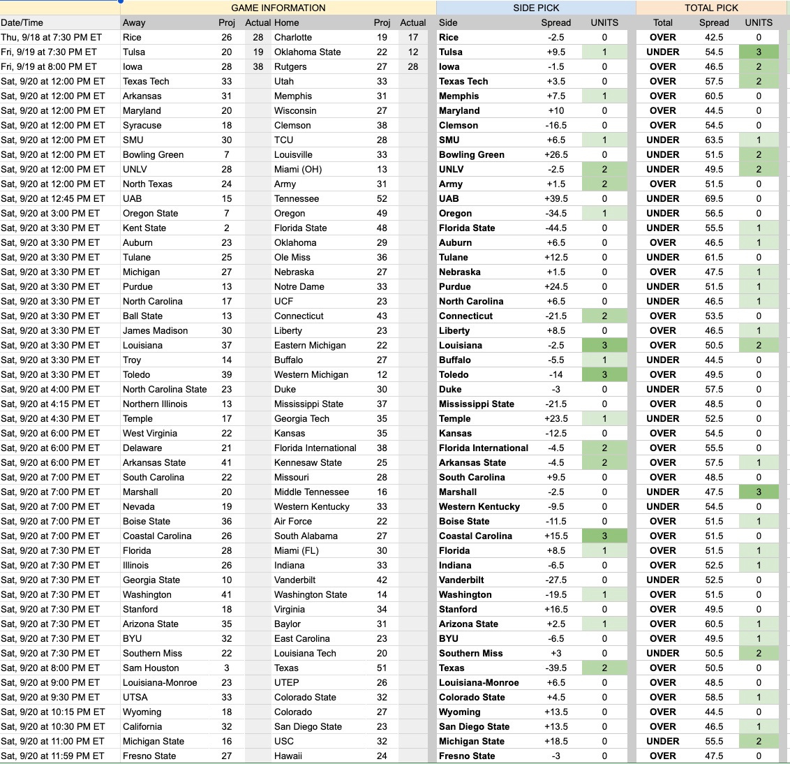 It must be noted that the Model is off to a rip-roaring 6-0 start, +5 UNITS. It really liked the Tulsa/OK State UNDER (3 UNITS) and the Rutgers/Iowa OVER (2 UNITS), to go with a single UNIT play on the Hurricane. Hopefully, you threw a Cover-3-style ‘moneyline sprinkle’ on that one as well. As we await the fate of the Mullet in Stillwater, we have a lot of football to get to on Saturday, so let’s see if we can keep this momentum going