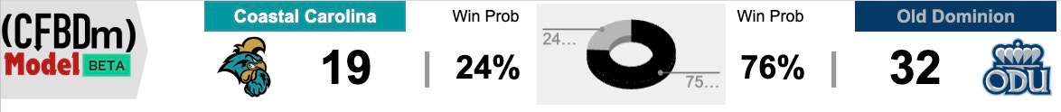 The Monarchs have surpassed just about everybody’s expectations thus far, en route to an early 3-1 record, including an impressive showing in week one against Indiana on the road, losing by just 13 points. They handled business against a down Liberty team last week and now get the Chants, who are coming off of a bye week. There are some linebacker injuries to look out for on the ODU side with star Jason Henderson already calling it a career. Koa Naotala and Mario Thompson are both ‘doubtful’ to play in this one and it’s creating a bit of a void in the second level. Not many G5’s can handle the loss of three starter-quality players at any position group. Does Coastal have what it takes to take advantage? That’s certainly questionable, but can they keep it within three touchdowns? That’s a bit more likely says the simulation: