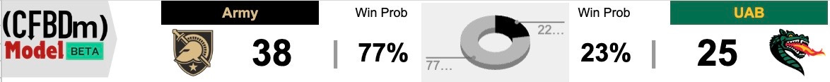 Army takes its usual spot as a “Model Play” here in week six. It’s been a roller coaster ride this season with a loss to open things against FCS Tarleton State, followed by an impressive win over K-State in Manhattan, and then two straight losses to good teams (North Texas and ECU). You see that 1-3 (0-2) record and think ‘big-time down year for the Black Knights,’ but the Model isn’t buying it. It sees this team as more talented — espectially in the trenches — than the Blazers. They have been challenged more to this point (34th SOS+ compared to 115th). It’s almost a touchdown spread, so it’s not like Vegas doesn’t realize this team is better than it has played, and it is on the road, but the talent difference is what the simulation sees and it has closer to a two-touchdown spread between these teams. It also sees an OVER play here as both offenses have the edge and it is worth nothing that UAB will be without S Sirad Bryant after he stepped on Tenneesee kicker Max Gilbert’s leg after a kick in their last game before the bye week.