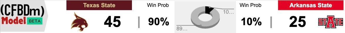 Yes, that’s a big number — but the simulation suggests it’s not high enough. We know about that Bobcats offense and it’s capabilities, but the key will be Arkansas State matching it throughout the game and avoiding costly turnovers. Texas State has a new injury to CB Jaden Rios and are already without starters Trez Moore (yet to play) and Will Mitchell II. Perhaps Jaylen Raynor can match what Brad Jackson and the Bobcats can do through the air and keep this going back-and-forth for a while? If the Red Wolves can chip in a few scores throughout this one, we see it getting into the seventies.