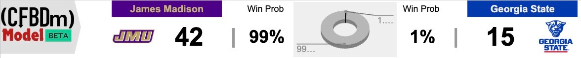 Another theme of the Model is fading this Panthers team. They just don’t have the talent-level of the competition. Now, looking at an almost three touchdown spread on the road is never something that screams ‘jump on it!’ but our simulation says to do just that. The Dukes are getting healthier as their running back room is loaded a couple of them — Ayo Adeyi (probable) and Jobi Malary (questionable) — are making their way back. Meanwhile, the Panthers are dealing with quite a few new injuries, especially on defense. A defense that have given up points in droves, albeit against some of the best competition a group of five school has played thus far (33rd SOS+), including Ole Miss (63 points ) and Vanderbilt (70). They did hold Memphis under 40, so there’s a feather. It just doesn’t set up will for the Panthers in their first Sun Belt game and it’s statement time for the Dukes, who will be making a run at that G5 spot in the CFP.