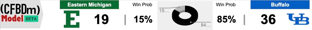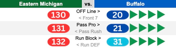 The Bulls have had a disappointing campaign in 2025. Their two wins are against FCS Saint Francis (PA) and Kent State. They have played close games though, and losing to Minnesota and UConn aren’t horrendous outcomes. The Model still likes the talent on this team and getting quarterback TQ Roberson back for this one is going to be a boon to the offense. They are well coached and disciplined, ranking 14th in FBS in penalty yards/game. Eastern Michigan remains without one of their top defensive players, DL Jefferson Adam and that adds to a major talent edge in the trenches — primarily on the offensive side for Buffalo, compared to the Eagles’ front seven. Even with C Jake Timm listed ‘doubtful’ for this one, James Carrington III should hold it down just fine: