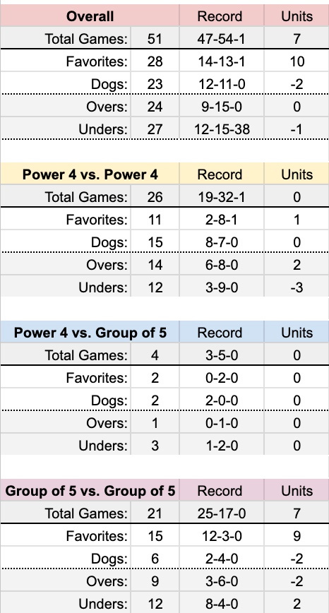 In week four, we finished above .500 as a whole but struggled in the higher-confidence plays (upped UNITS). So, we thought, maybe we need to go to a “spray the board” approach. It wasn’t the right week to do that. So, we battled back late, and even though we posted our first sub-.500 week as a whole, we still managed to go +7 units, moving us to +11 on the season. Remember, we don’t suggest plays on any of our zero UNIT plays. However, we will still grade them and refer to them as “leans” to assess our overall progress. We lock the consensus spreads on Saturday morning.