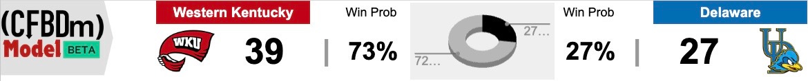 This is certainly a trend we’ve seen in the Model, and it’s worth noting that it is unlikely to be what it sees from the talent level in Delaware. This has been largely unsuccessful — other than the sneak by from Colorado in week two. It is possible that the Model is just not catching up to this 3-1 Blue Hens squad, and it’s going to go well too often. However, if our Model were like the rest, it would ignore the player-level talent gap and go solely off the results, which would put us right where Vegas has this one. So, maybe it all comes to roost tonight?