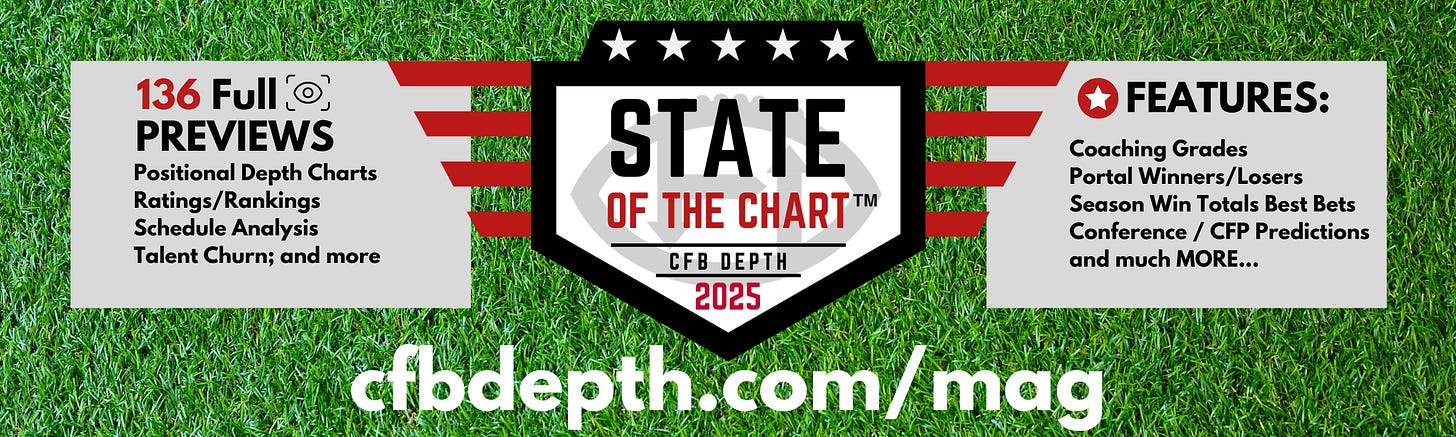 This is just some of the in-depth information you’ll find in our first State of the Chart™ Digital Magazine, set to release in July. It will include literally everything you’ll need (and a lot more) for all 136 FBS schools. Each team has six pages dedicated to it, including positional depth charts and write-ups, strength of schedule and win totals projections, and much more. For more information on the magazine, click on the banner below. We’ll be sending sneak previews throughout the summer leading up…thank you for your support and following.