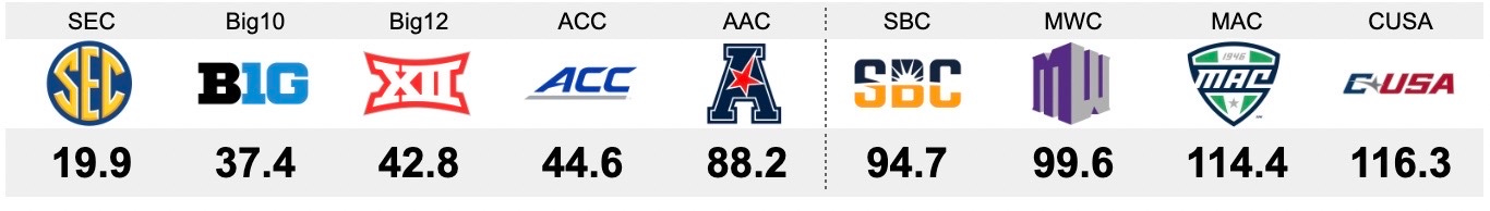 We need to find the top five-rated conferences. For this, we'll use our All-In Rankings (AIR) to determine who gets the automatic bids. We will use the highest average AIR amongst all teams in the Conference. We know the first four, though it's fun to see who comes out on top there, too, but the real test is to see which of the G5 conference champions is going to get into this field. In 2024, it was Boise State. Let's see who it is in 2025...