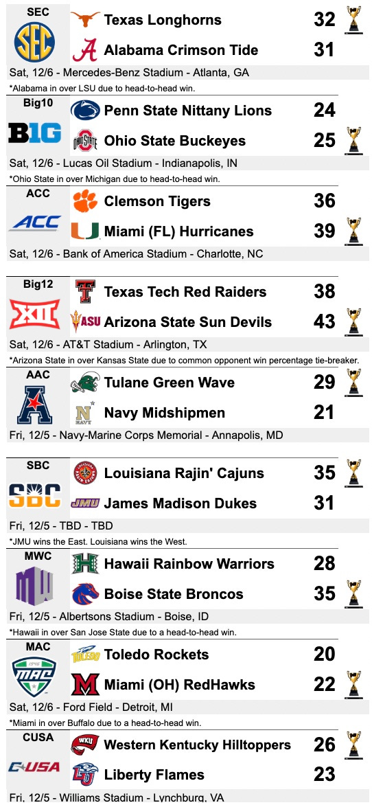 As you can see, one Model surprise has Hawai'i competing for the Mountain West title. That may surprise some (myself included), but we don't mess with the Model in this case. Texas Tech runs the table in the regular season but falls to Arizona State in the Big XII Championship shootout. There are a few other upsets in the group of five finales, as well. WKU beats host Liberty, and Toledo falls to Miami (OH), despite an undefeated MAC regular season.