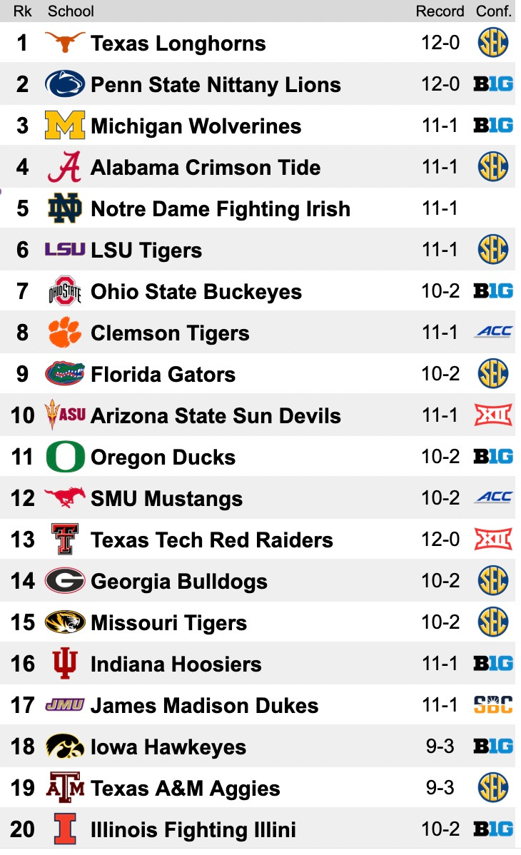 Now, the fun really starts. We get to set our 12-team bracket with seedings. We got a look at the pre-Conference Championship CFP rankings up above. So, we'll go off of those. We'll start by slotting in the Tulane Green Wave at #12. We'll go back up to the top to get the four 'bye' weeks. The Texas Longhorns are the clear #1 seed, sneaking by the Crimson Tide in the SEC Championship for an undefeated regular season. The Buckeyes threw a wrench into things by beating Penn State, which was the clear #2 heading into CC week. Even with that big win, Ohio State still suffered two losses, albeit to Texas and Penn State, by a combined five points. We still can't put the Buckeyes ahead of the Nittany Lions, and that incredible regular season is enough to secure the #2 seed for the Penn State Nittany Lions. This is where it gets weird…