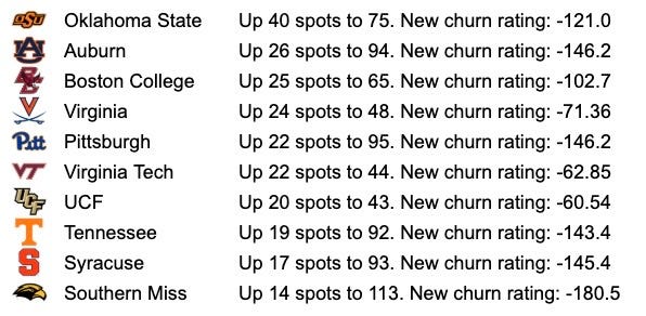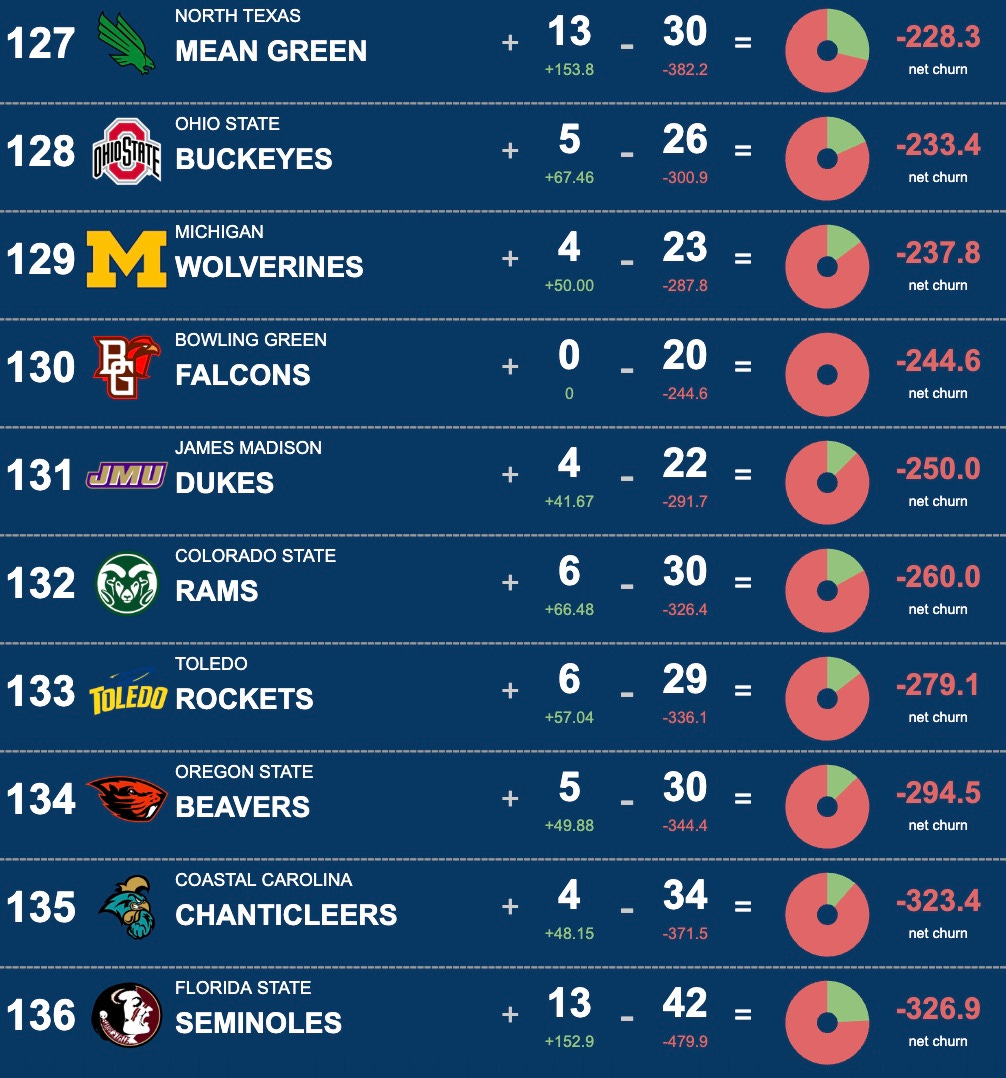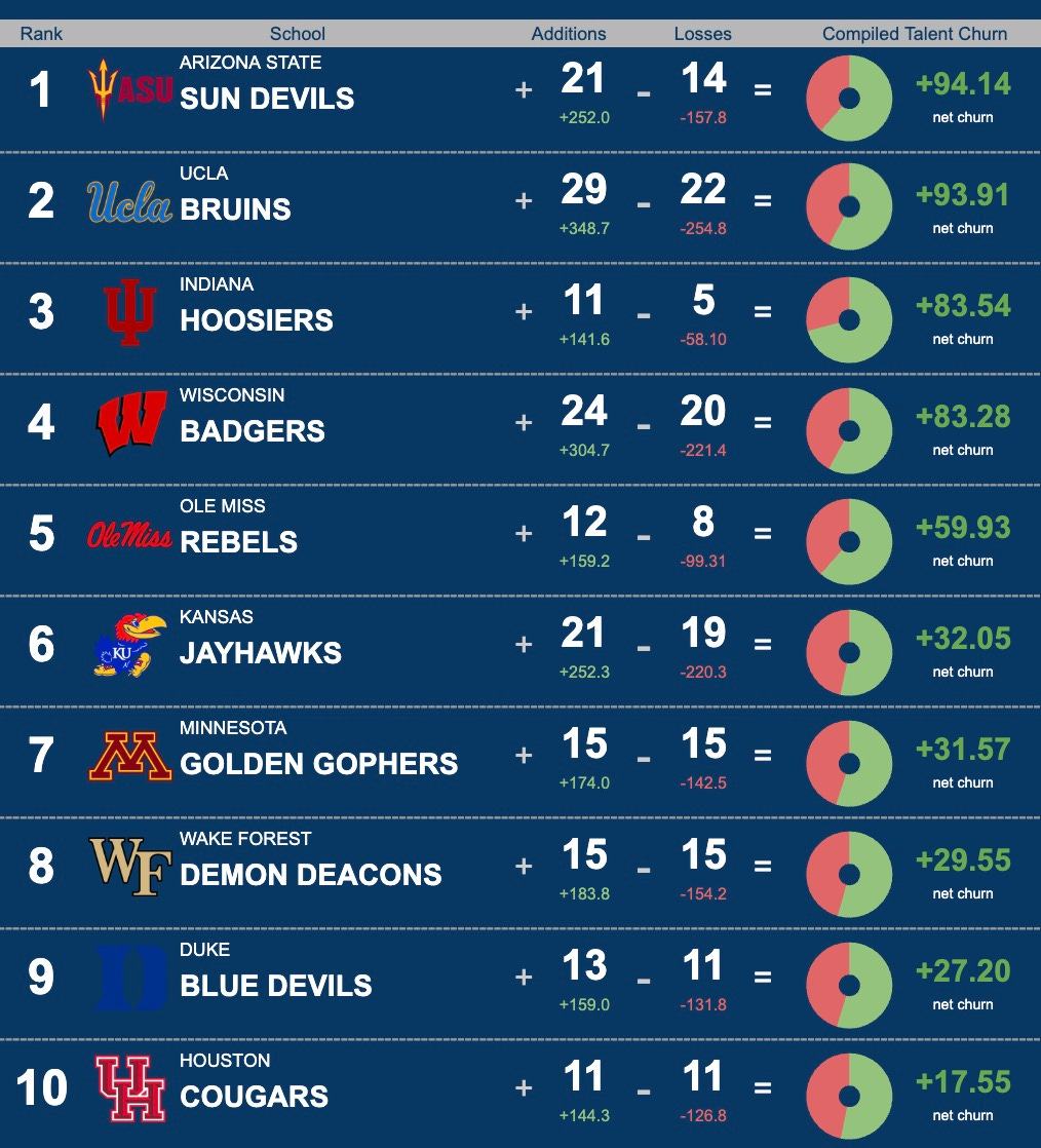 We have a new leader in the clubhouse as the Arizona State Sun Devils have jumped the Indiana Hoosiers for the top spot in our portal talent churn rankings. The UCLA Bruins also jumped the team playing for the National Championship into second place as Bob Chesney is doing work early in his tenure in Westwood. Kansas jumps from #10 to #6 and we see Minnesota enter the top ten at #7. Texas Tech and Arkansas fall out.