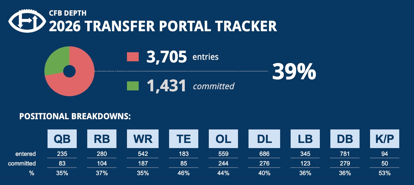 With six days left in the window, we have reached over 3,700 players in our tracker. There are more that will find their way in after signing with FBS schools, especially the smaller ones. The 39% signing rate is a bit surprising and definitely faster than a year ago, as teams become more adept at this portal game. Time can not be wasted. That said, after the initial rush, we should see a settling down a bit, allowing time to be spent to fill out the rest of the rosters and some players will be out of luck. They will need to level down and have big seasons to work their way back up. We’ve seen that work before.