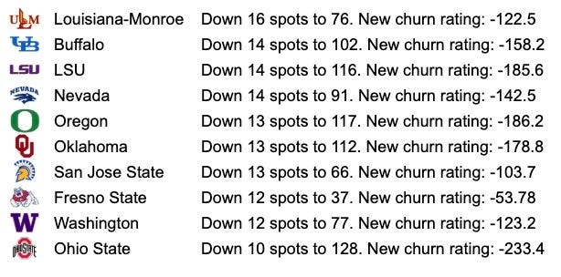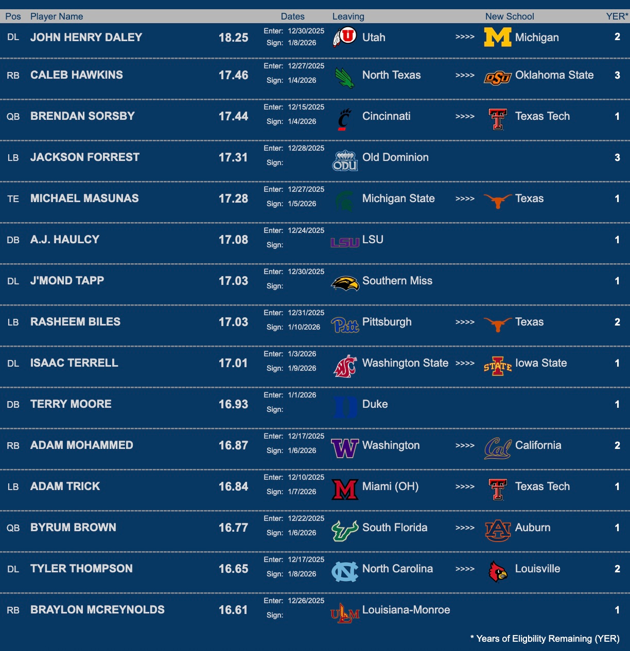 There was a time early on in this portal cycle that Oklahoma State was at the very bottom. The exodus following the disaster of a 2025 season was swift. Now that Chad Morris has had time to come in, bring his top player from North Texas and add a few more here and there, the Cowboys are very much on the upward trend. They are the biggest mover again yesterday, picking up 40 spots to #75, squarely in the middle of the pack now. The big name(s) from yesterday joining the movement is former Wake Forest WR Chris Barnes [15.3] and former UCLA LB Isaiah Chisolm [13.4]. Impressive.