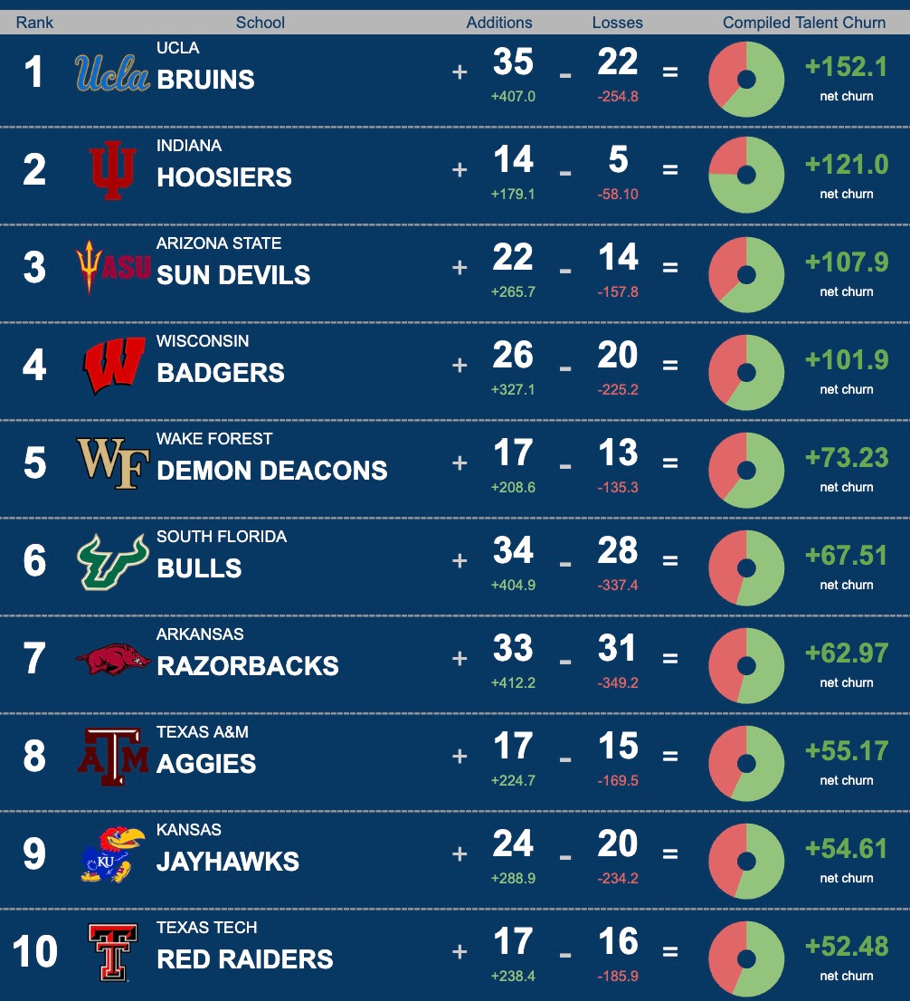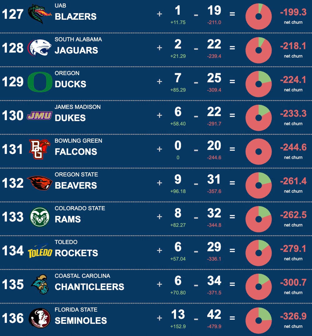 We are tracking full roster talent churn. It’s important to note that this rating and ranking is 1.) portal-only and 2.) total roster talent churn. This means that we are counting every player who is coming and going to come up with this ranking. Later, we will dive into actual impacts by projecting rotational playing time. We had some questions about this and thought it important to describe in more detail.