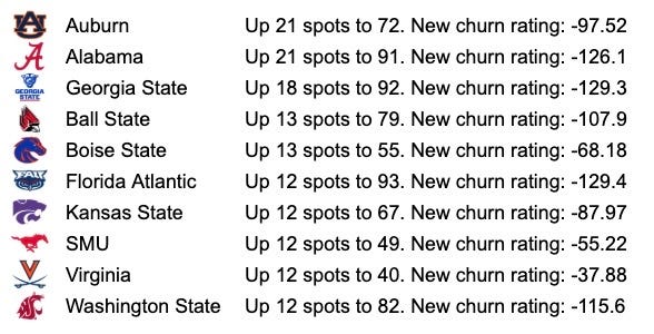 As mentioned above, the movement from South Florida to The Plains is in full-go mode. The Auburn Tigers, now led by Alex Golesh, is the biggest mover up over the last 24 hours. They picked up two Bulls’ starting offensive linemen, C Cole Best [13.2] and RG Cole Skinner [12.7]. They also added CB Shamar Arnoux [11.8] from FSU and depth QB Tristan Ti’a [10.9] in from Oregon State.