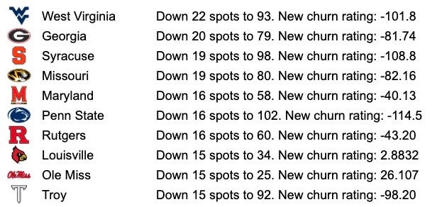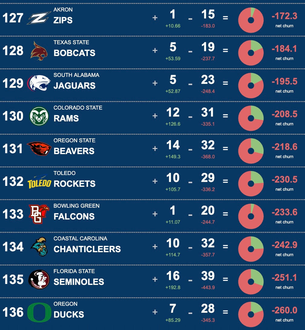 Before you panic (or send a hate response to us), Ducks fans, remember that this is simply ‘roster talent churn’ and not our “All-In Rankings” for 2026. The teams with the deepest talent pool always will churn more of it as players look for opportunities to play. When we move all these to “2026 Mode”, you’ll see some of those sticking around and moving into starting roles raise their level and keep Oregon in their rightful place in the top ten overall.