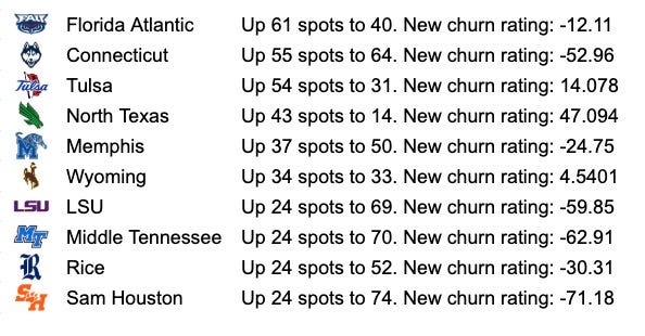 You’ll see more movement because of our data reconciliation. FAU is loading up on players, but theirs is certainly more volume based. North Texas has jumped all the way up to 14th overall despite all of their losses — a big testament to Neal Brown and his staff working quickly to keep the roster talent level up and continue the success in Denton.