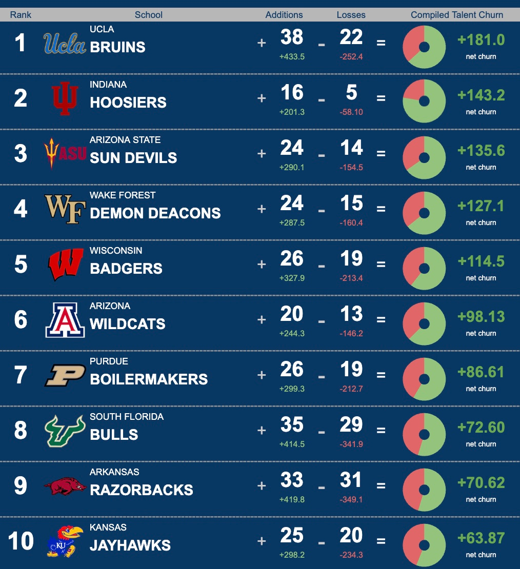 We are tracking full roster talent churn. It’s important to note that this rating and ranking is 1.) portal-only and 2.) total roster talent churn. This means that we are counting every player who is coming and going to come up with this ranking. Later, we will dive into actual impacts by projecting rotational playing time. We had some questions about this and thought it important to describe in more detail.
