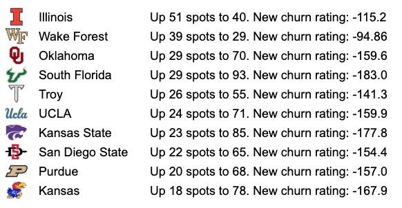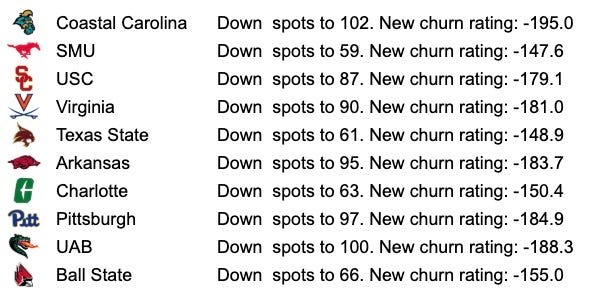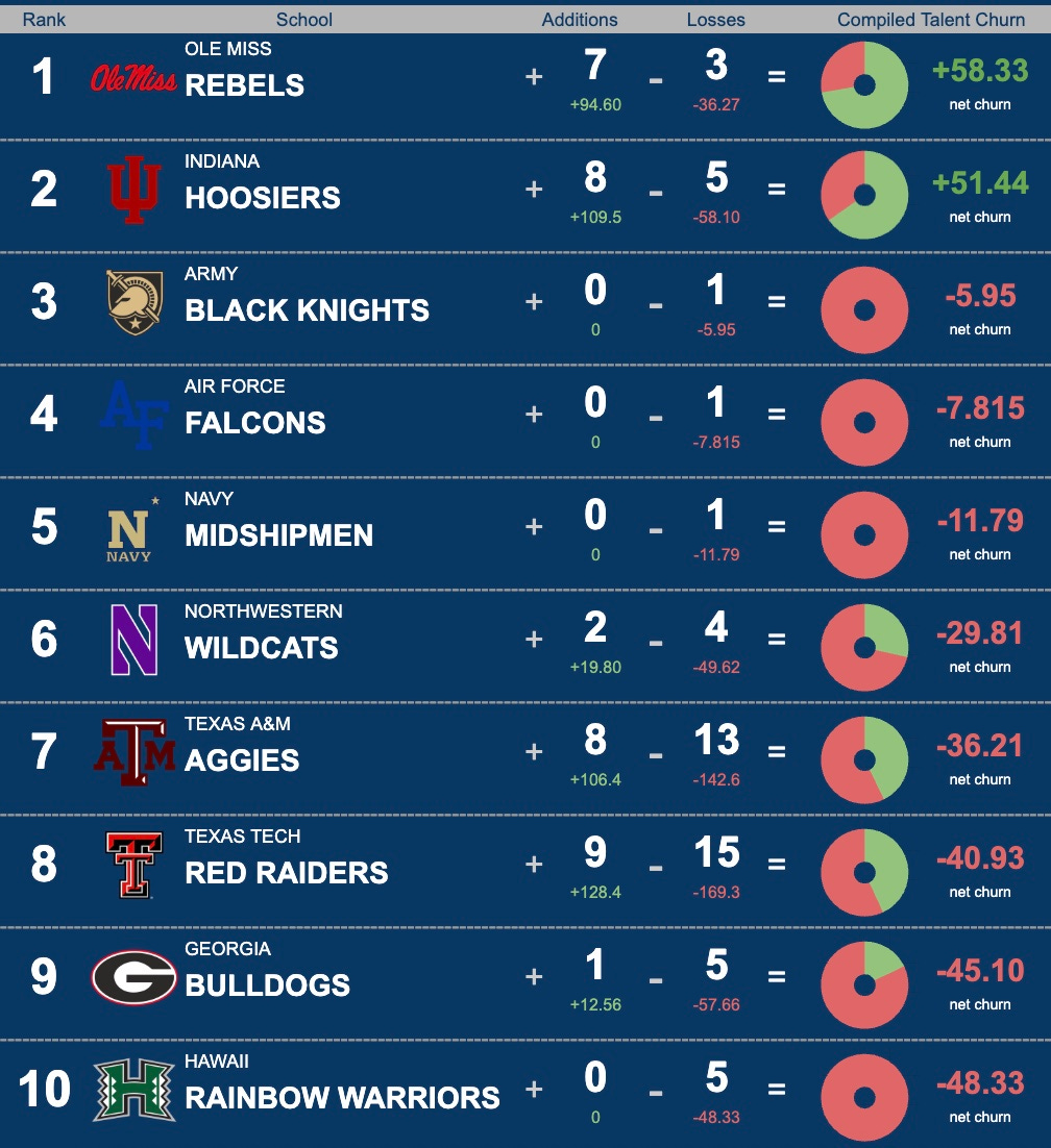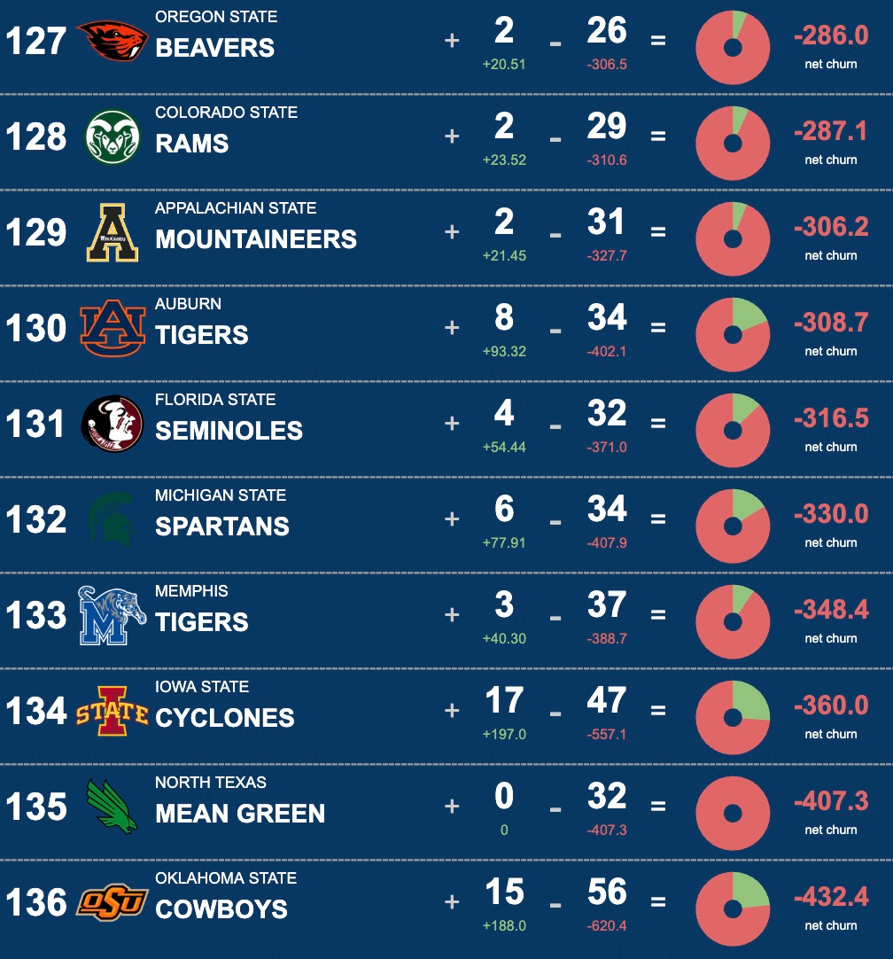 Not a lot of change at the top here with Ole Miss and Indiana remaining as the only two in the positive talent churn space. That’s unsurprising as they are still playing football. Once the season ends, they will begin to see some negative churn as top players will try to find homes where they can play more often. Outside of the expected services academies, good news out of Northwestern and Hawai’i as both programs are retaining players (even with one stud leaving the Warriors — WR Jackson Harris is headed to LSU).