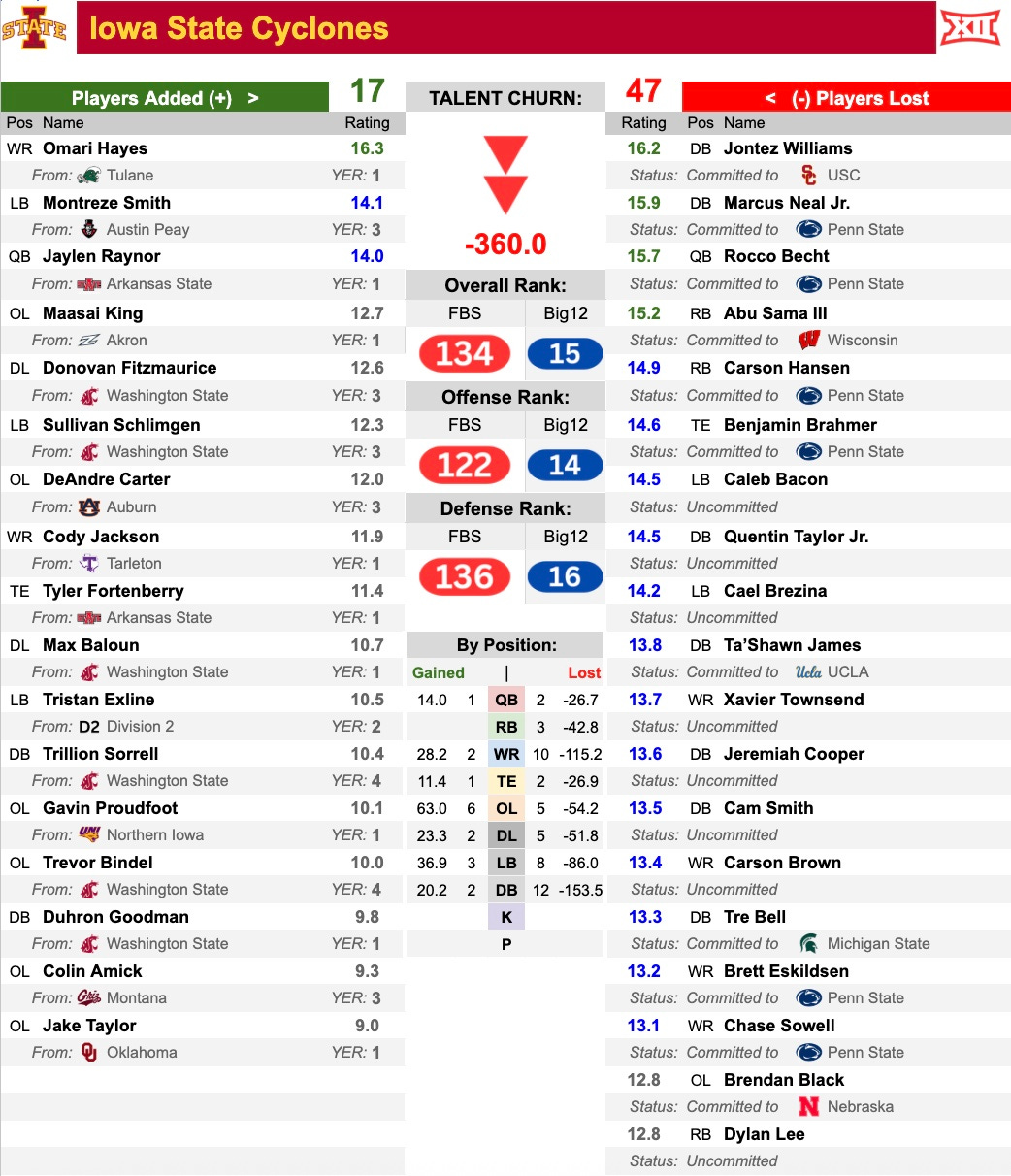 47 players is a lot to replace, especially with so many of the top guys following Campbell to Happy Valley. So, they are still ranked in the bottom five of total talent churn, but Iowa State faithful should be feeling good about what Rogers and his staff are doing at this point.