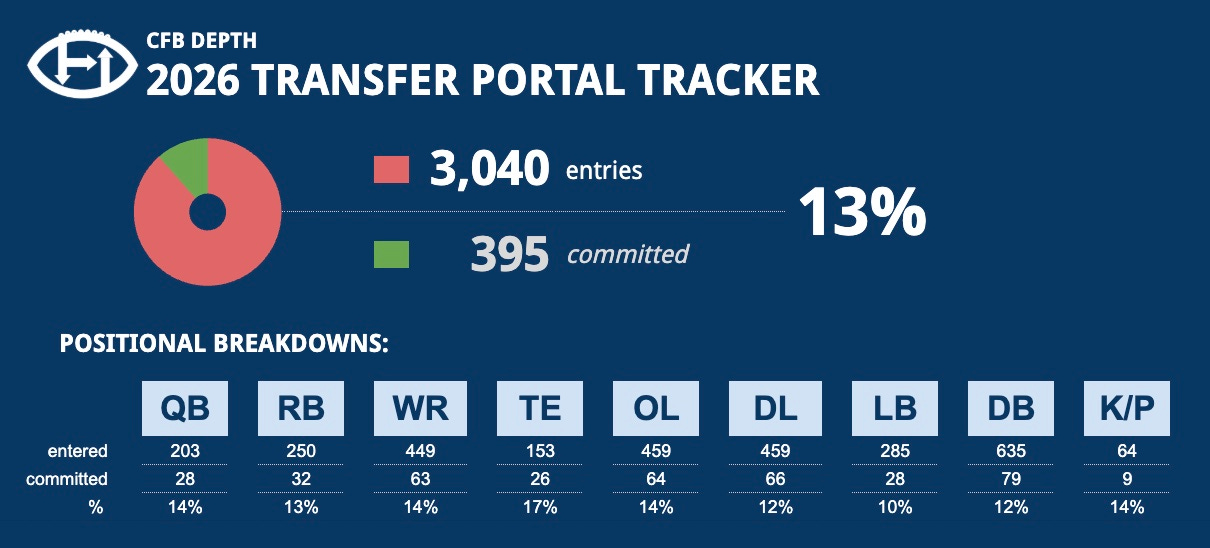 With that busy day of signings, we have moved up to 13% of players committed with a similar percentage shown by each position group — with the linebackers being the slowest to commit (10%) and tight ends pacing the groups (17%).