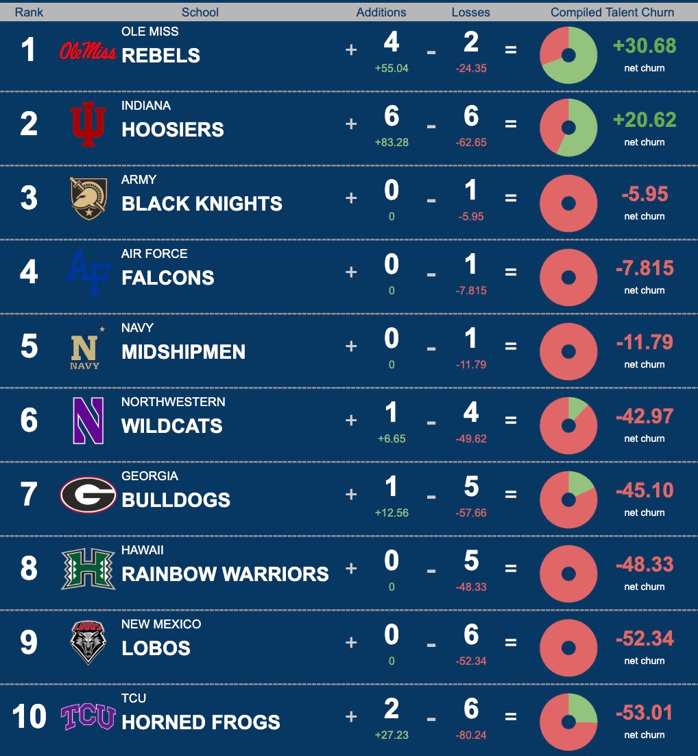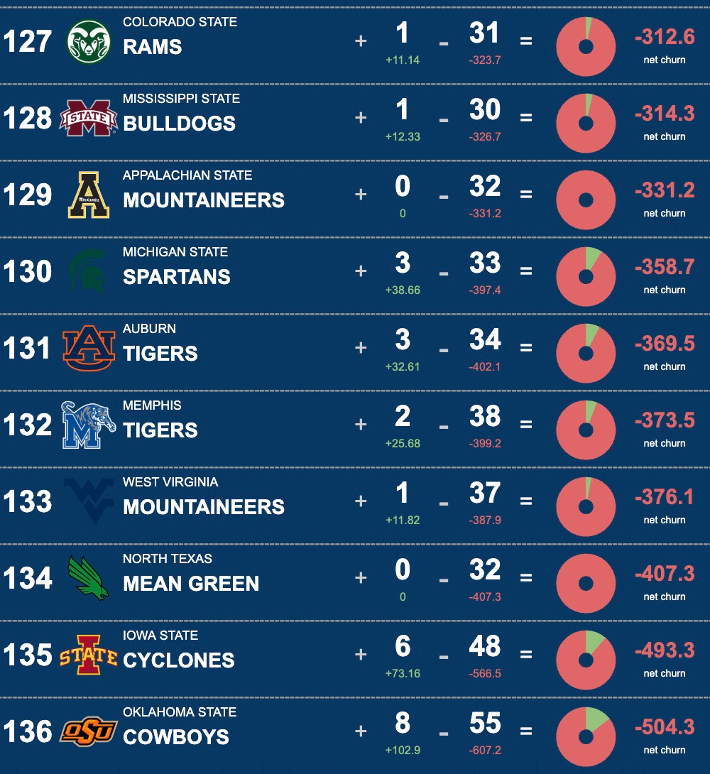 Out of the gate, it’s no surprise to see teams still competing in the CFP to be at the top. They are more likely to hold on to their top players through this season’s competition. It’s also not unusual to see the service academies (Army, Navy and Air Force) towards the top as they all retain their players better than most. They will also not participate on the other end and will slowly slide towards the middle when this all wraps up, and camps begin to open. Right now, other than Ole Miss, Indiana, Oklahoma State, Iowa State, and Colorado, this is a good snapshot of who is best retaining their players early on in the portal cycle.