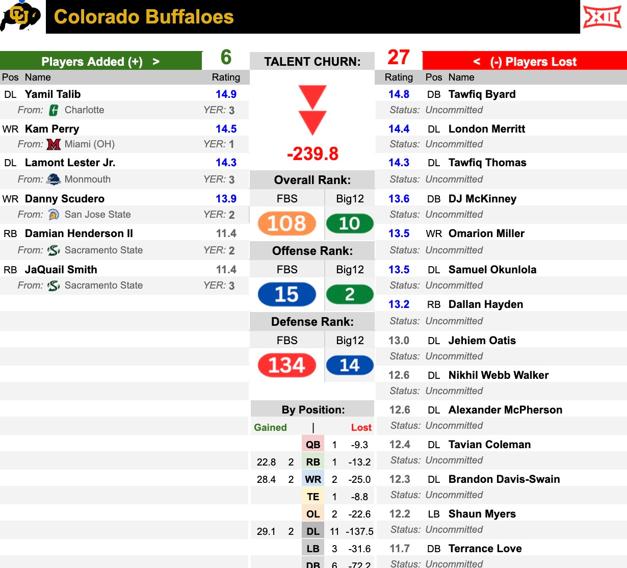 With ‘free time’ to work with, Coach Prime is working the portal early and often. They announced five impact signings yesterday alone. However, it’s only working towards getting them closer to the even mark, as they did not do a great job of retaining talent on the roster. That’s what makes our ‘portal tracker’ system a bit different. Many will fawn at the signings, but lose sight of the losses. Our ledger-style tracker for each team weighs them both and provides a holistic view of the talent level on the roster. Here is a quick look at Colorado’s ledger view with a link if you want to check it out:
