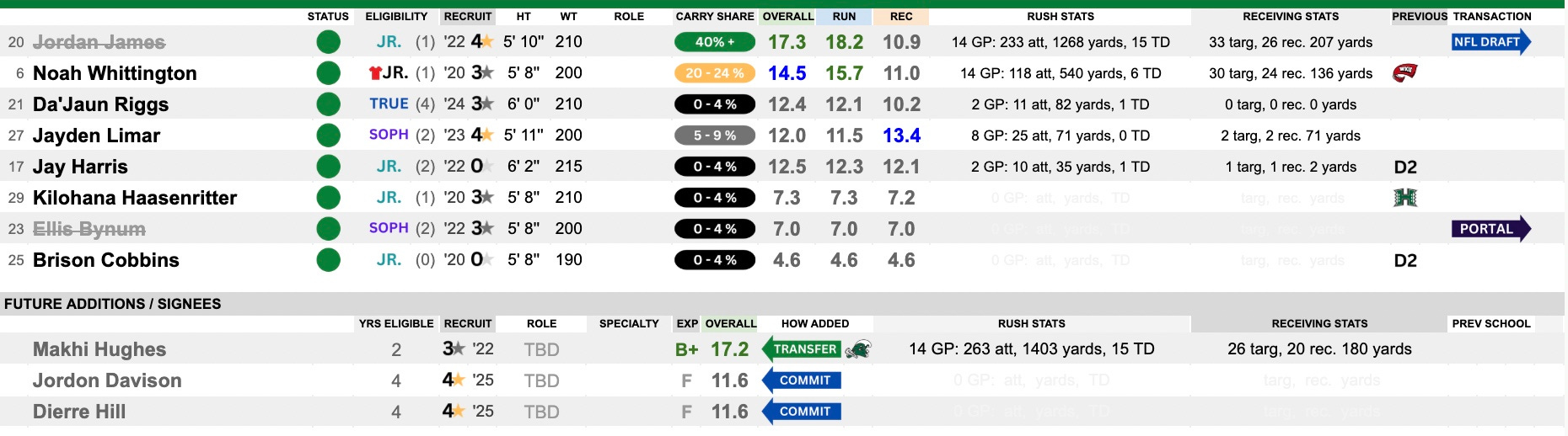 It’s difficult to imagine that this talented group had any struggles, but it wasn’t always that easy. Jordan James pulled away from Noah Whittington as the leader and showed out with over 1,200 yards and 15 touchdowns. He is heading to play on Sundays and Whittington is joined by big-time transfer back Makhi Hughes, coming in from Tulane. Expect Hughes to play the James role with Whittington remaining the backup and change-of-pace. There shouldn’t be any drop off here.