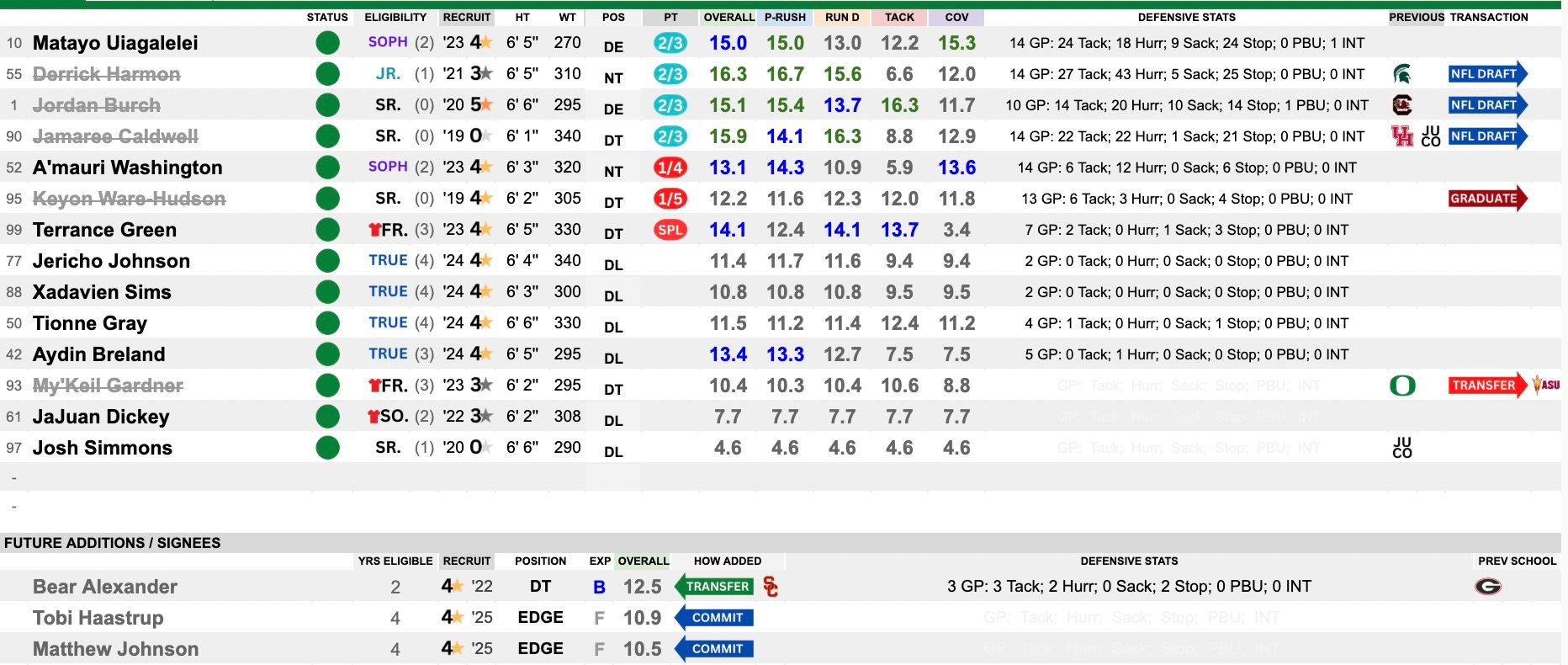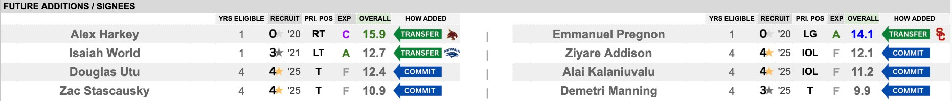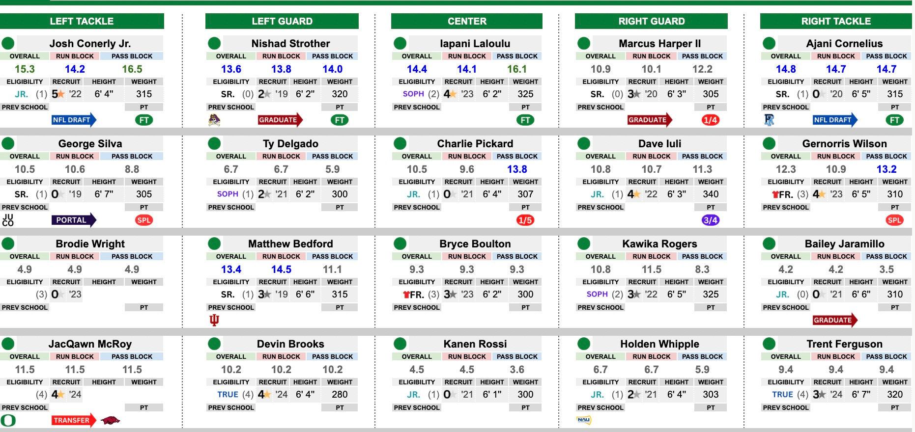 This was a really good group and highly rated, however, they didn’t perform at all times like an elite unit. They will go through a complete re-build with four of the five primary starters moving on. Only center Iapani Laloulu returns. They hit the portal early and bring in two stars to help fill spots with Alex Harkey (Texas State) and Emmanuel Pregnon (USC) joining up. Isaiah World (Nevada) is another solid addition, who may earn a starting spot as well. They have the pieces they need — now it will be about creating the cohesion needed to perform at a high level.