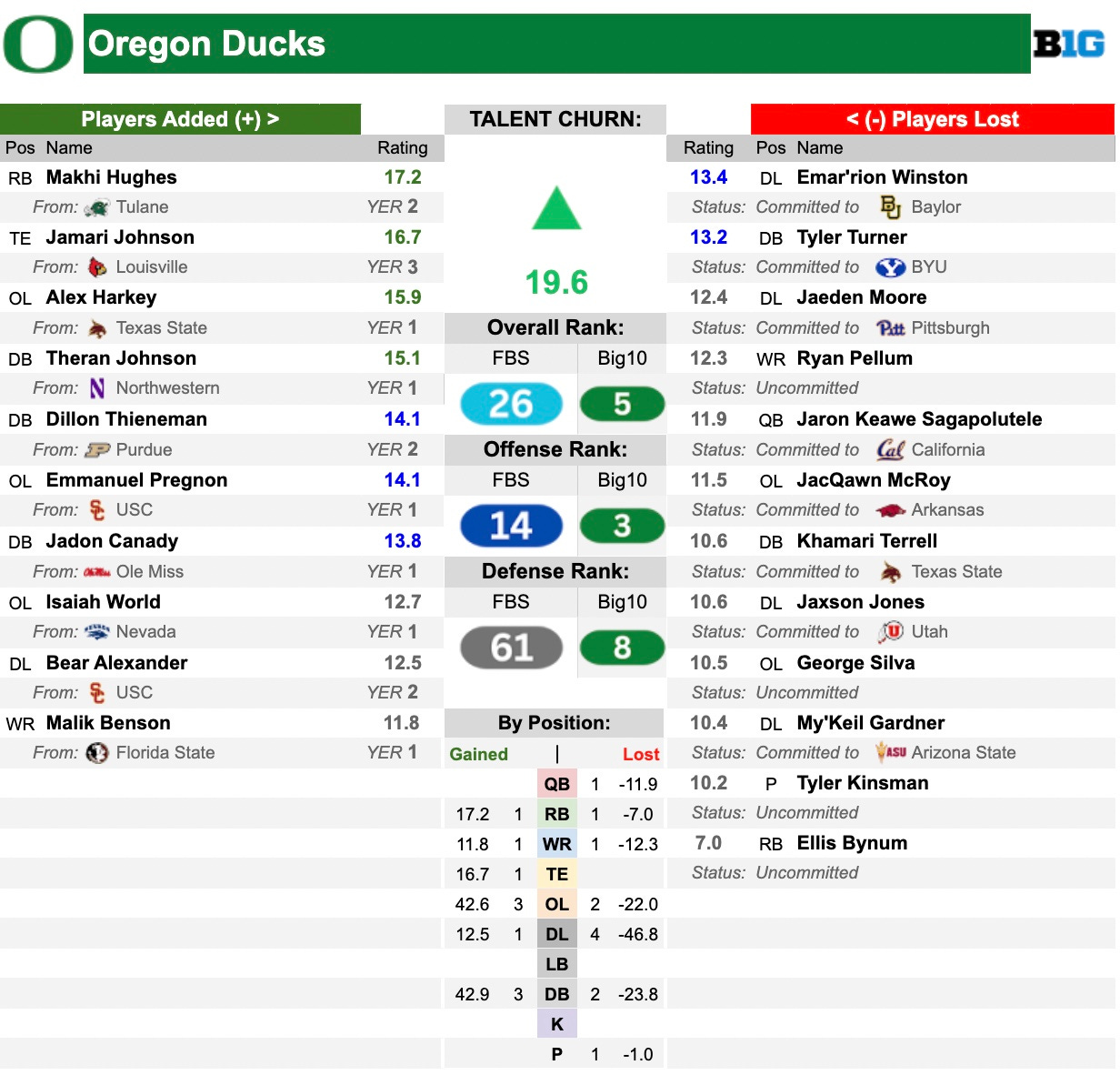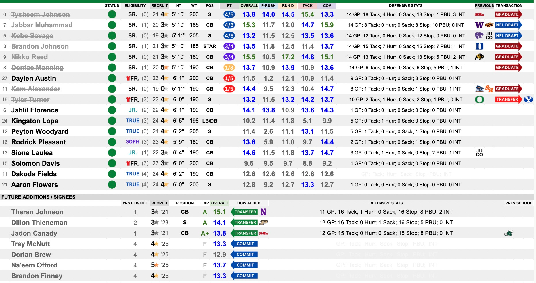 This looks like a success as they managed to get some big time transfers, led by RB Makhi Hughes, TE Jamari Johnson and OL Alex Harkey. They also hit the defensive backs hard as they need to rebuild that unit. They got three really good ones in Theron Johnson (Northwestern), Dillon Thieneman (Purdue) and Jadon Canady (Ole Miss). The impact losses were limited to DL Emar’rion Winston (Baylor) and DB Tyler Turner (BYU).