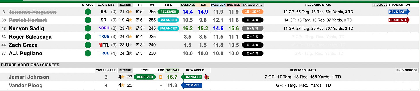 Terrance Ferguson was a big part of this offense with Patrick Herbert chipping in and playing a secondary role — more as a blocker. Both move on and they replace Ferguson by bringing in one of our highest rated players in the portal in Jamari Johnson from Louisville. Meanwhile, Kenyon Sadiq was a true sophomore last year and chipped in with 25 catches (on 27 targets!) for over 300 yards and a couple of touchdowns. These two should create a dynamic 1-2 combination and be very involved in this offense.