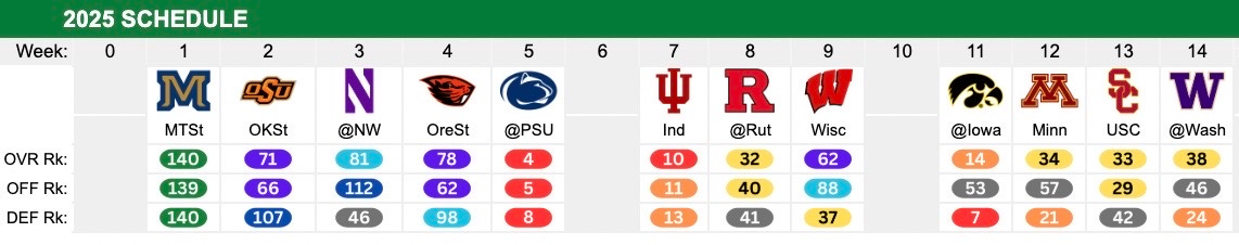 They had enough of Ohio State in 2024, playing them twice, so they avoid the Buckeyes — at least in the regular season. They do have to travel cross-country to Happy Valley (Penn State) in week five, which should be their real first test of the season. They get the bye following that trip and then get Indiana traveling up to Eugene. Even if they lose that Penn State game, there are not two other losses on this schedule outside of a major collapse. They should handle this and get back into the CFP mix in 2025.