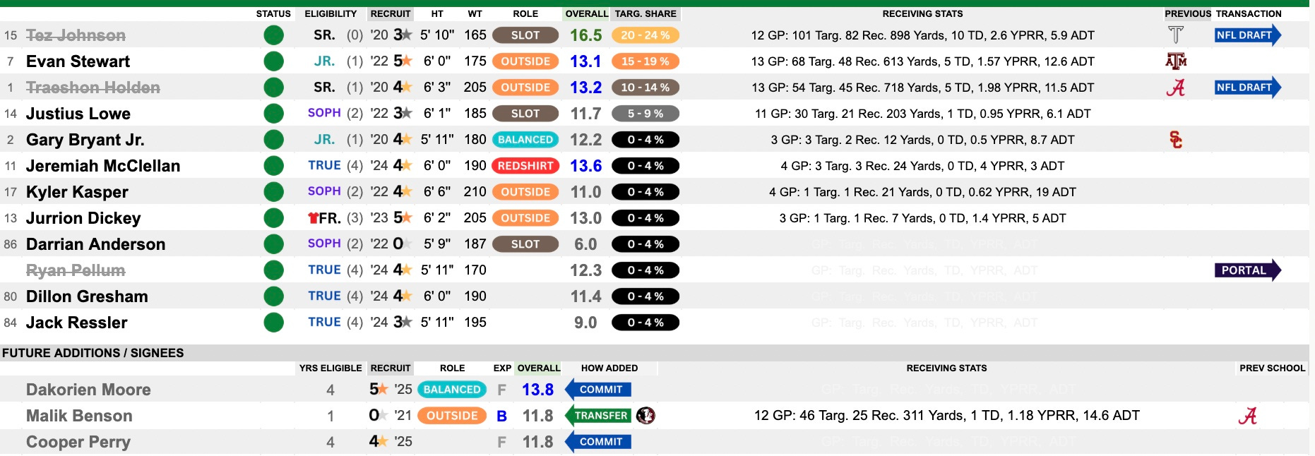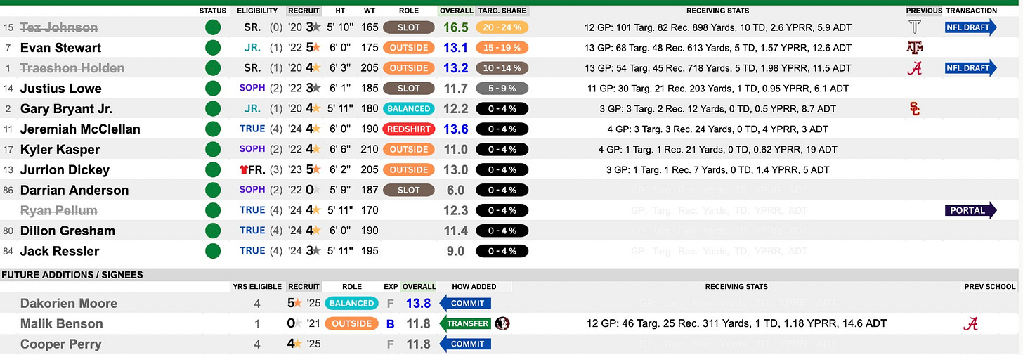 This group was talented and deep. Evan Stewart came in from A&M and was a nice compliment to the leader Tez Johnson. Traeshon Holden (former Alabama) also played a big role here. With Johnson and Holden heading to the NFL — Stewart will be asked to take on that No. 1 option role going forward. They bring in Malik Benson from Florida State to play a role and expect Justius Lowe to become a highly targeted slot option for this turned over passing game. They get 5-star Dakorien Moore coming in and could see the field right away.
