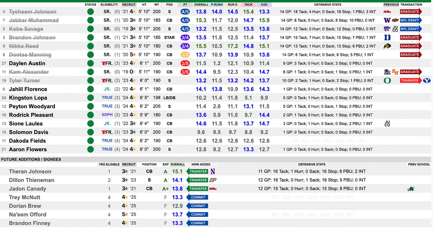 OFFENSE: Will Stein’s offensive unit was the most talented group by our ratings system, derived of player ratings and rotational playing time. The interesting thing about this offense is that they almost seemed to hold back a bit. They were slightly one-dimensional and the surface stats left some to be desired. Their 34.9 points per game was 17th in FBS. Their 6.39 yards per play was 20th. It’s not like their numbers were off the charts like other Ducks offenses we’ve seen in the recent past. They made the adjustment at quarterback from Bo Nix to Dillon Gabriel. It worked just fine. The offensive line was good, but not elite. The run game was actually somewhat middling, putting up 157.9 rush yards per game (72nd) and 4.43 yards per tote (63rd). Passing was where it was at — they put up 8.5 yards per attempt, which ranked 14th in FBS. Again, none of these numbers entered the top ten. They were explosive in the pass game — 46 plays of over 30 yards — but were not in the run game with just six such chunk plays. They made their hay with effciency in the red zone, scoring touchdowns 73% of the time (13th) and were great on third down (48.6% conversion rate). You get that with a veteran quarterback.