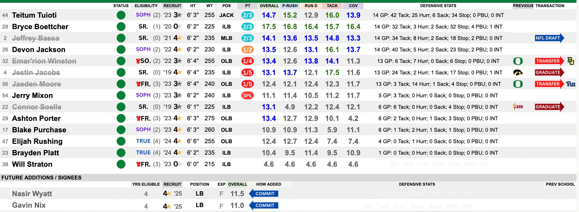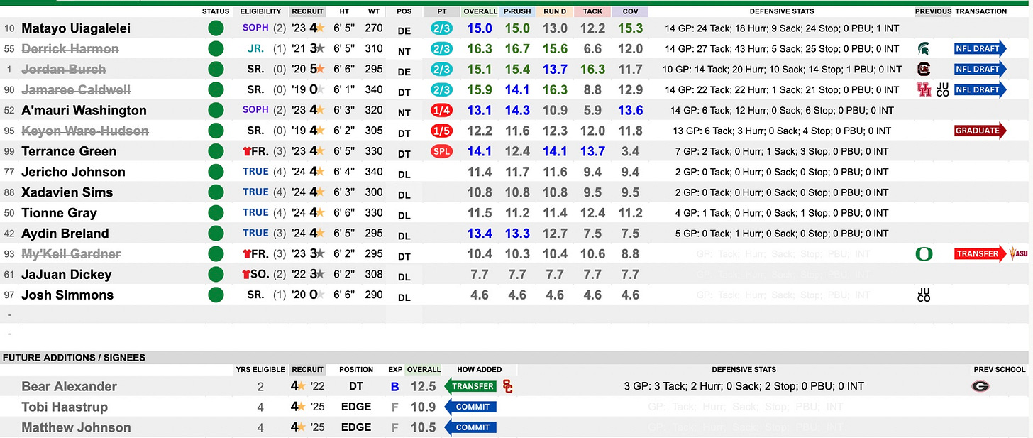 This was a really strong group, led by the fearsome foursome of Matayo Uiagalelei, Derrick Harmon, Jordan Burch and Jamaree Caldwell. Three of the four are heading to the NFL with Uiagalelei the only returner. They were hoping Caldwell could get another year and return via the Pavia rule, but that isn’t likely to materialize. They will need some young players to step up into roles and maybe this can be the place that can unlock the talent of one Bear Alexander, coming in from USC via the portal.