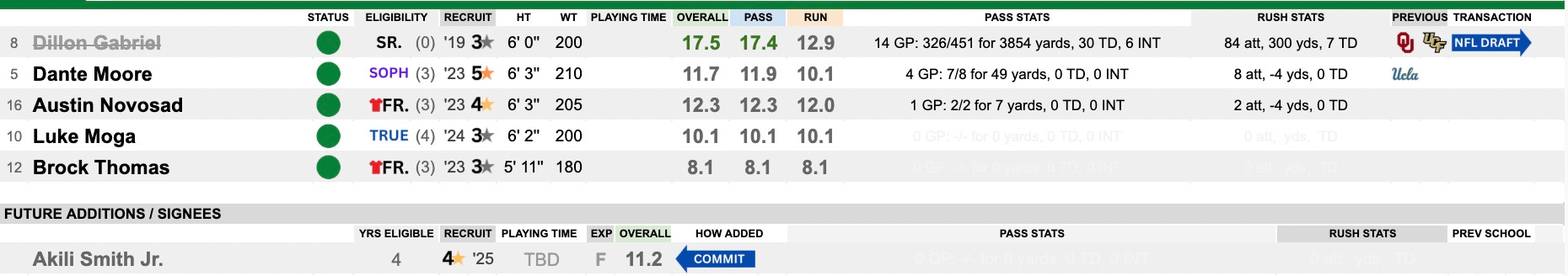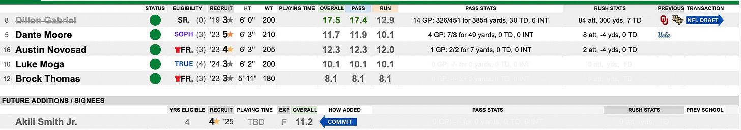 Dillon Gabriel came in from Oklahoma and replaced Bo Nix with little disruption. They were thinking ahead here and landed UCLA transfer and former 5-star with a little experience in Dante Moore in last year’s transfer class. It appears he will take the role in 2025. He was able to learn for a year under Gabriel. He’ll need to prove it, but the stage is set. Austin Novosad is the backup.