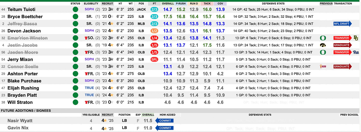 Another super talented and deep group, led by Teitum Tuioti and Bryce Boettcher, with Jeffrey Bassa manning the middle. Bassa moves on to the NFL and three contributors are also not returning due to leaving via the portal and graduations. With Tuioti, Boettcher and Devon Jackson returning, they will have a solid front lines with other young players asked to step into roles. They should be able to match their output in 2025.