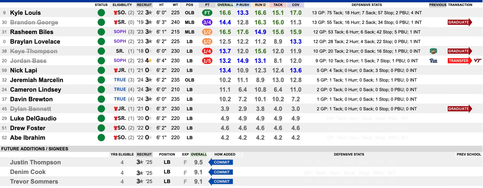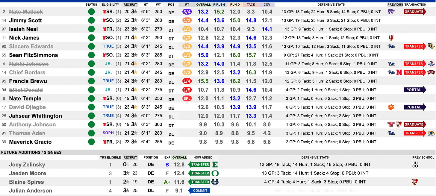 This was a solid grouping led by Nate Matlock and Jimmy Scott. They combined for 11 sacks and over 45 hurries. Matlock moves on, but Scott returns for his RS-Junior season. Isaiah Neal and Nick James return as contributors. The loss of Sincere Edwards to UCF hurts, as he showed well in his limited role as a true freshman. Sean FitzSimmons is another name to watch here. They add in a few high-upside transfers, and this should continue to roll in 2025.