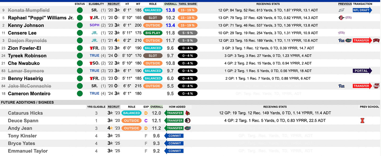 This high-volume passing attack featured three ‘go-to’ options: Konata Mumpfield, Poppi Williams Jr., and Kenny Johnson. They each got over 70 targets. Mumpfield made the most of those opportunities. He heads to the NFL, while both Williams and Johnson return as the new 1-2. There is room for somebody else to step up, with plenty vying for that opportunity. Keep an eye on Andy Jean, coming in from Florida, who battled injuries to make a run at impacting this room.
