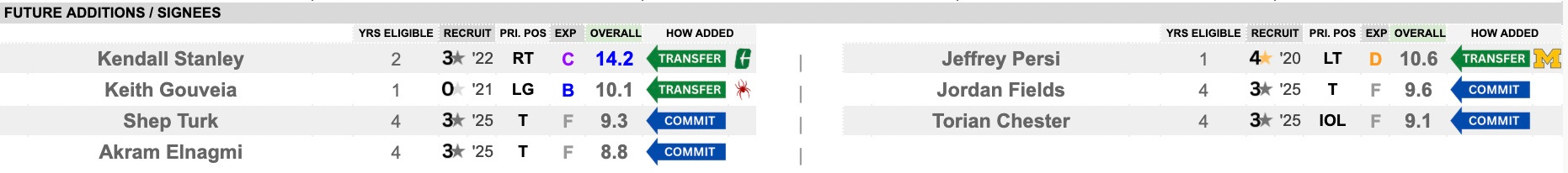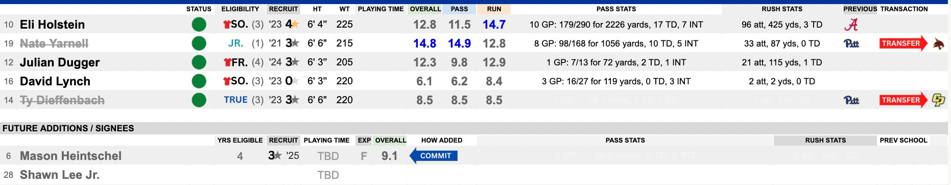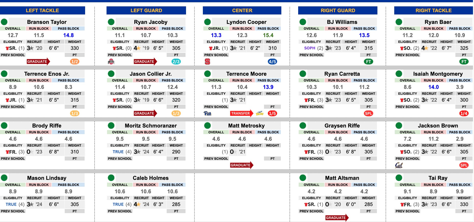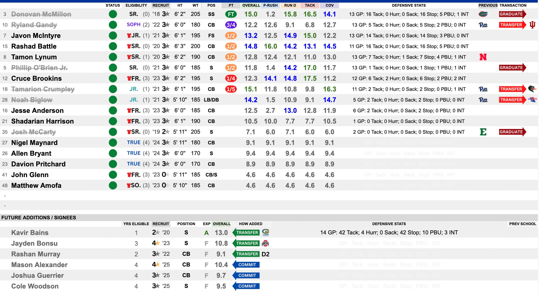 This was the Achilles heel of the offense. They couldn’t quite do everything Bell wanted to do as this unit struggled to find its footing. Be it injuries and having to mix-and-match or just a general struggle to grasp the schemes, it didn’t work. They get back their center, Lyndon Cooper, and the right side of the line. They bring in tackle Kendall Stanley from Charlotte, who grades as an impact starter. Jeffrey Persi is a former 4-star from Michigan who could be in the mix. A little cohesion and talent infusion could work wonders here.