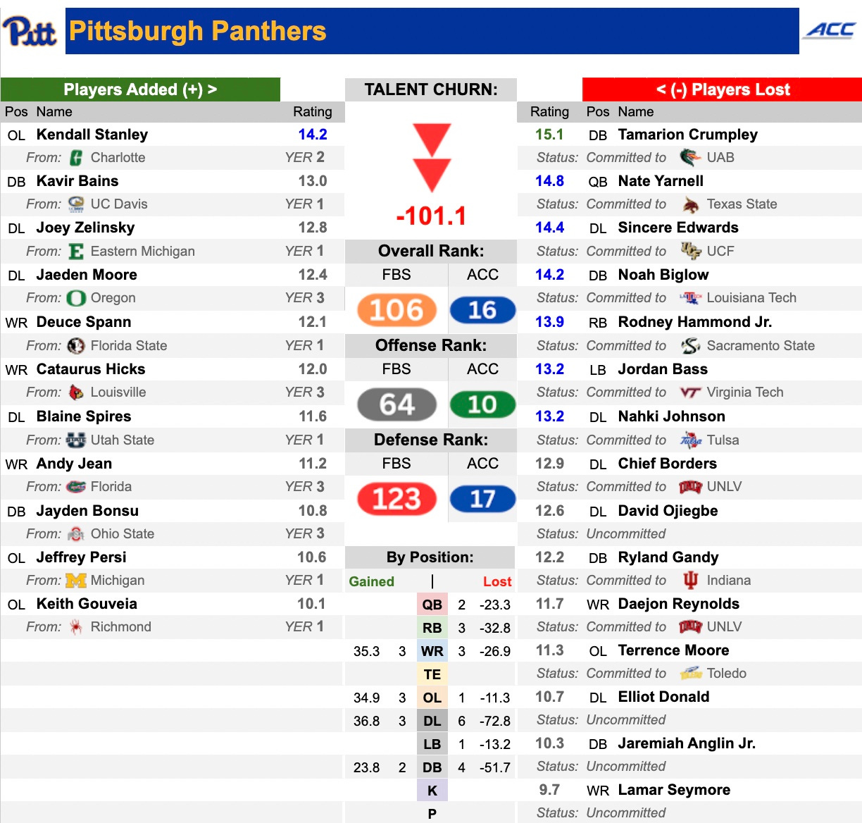 This one hurts a bit with that red number showing over 100 on the wrong side of the ledger. There is still time to impact this in the spring window, but losing some key pieces will affect the overall talent level of the roster. Some of those losses are at positions where they are well-positioned, like quarterback (assuming health) and running back (with Reid returning). OT Kendall Stanley (Charlotte) was a significant pick-up for the offensive line and one of the most needed. Not great, but it's also not the end of the world.