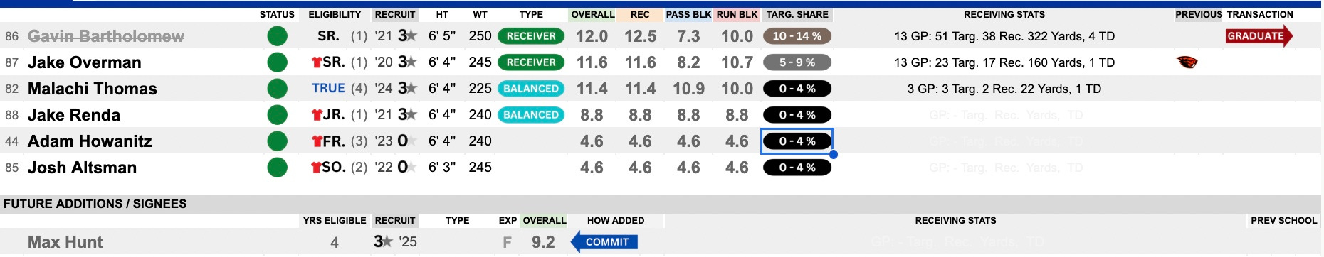 Gavin Bartholomew was a solid option for the offense, as the tight end does get involved in Bell’s offense. He caught 38 of 51 targets and scored four times. He’s gone, but everybody else behind him returns. They like what they have in Jake Overman, who chipped in with 17 grabs in limited action. He will take over the lead role and could top Bartholomew’s impact. Malachi Thomas is next in line, as Overman has just one year of eligibility left.